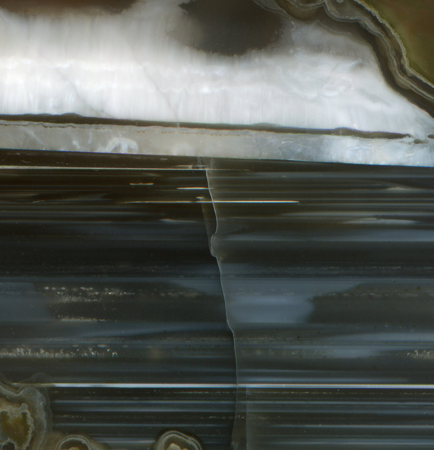 An interesting specimen with tilt lines. The main tilt takes place towards the top, but there is also some very very slight tilt going on lower down (in different directions), which is only really visible if you place a horizontal line against the image. Note that the crack in this one seems to end precisely on the point where the main tilt starts - though there do seem to be some faint marks in the agate above it, which I am not really sure about. Angling the stone against the light reveals that the visible flaw in the surface stops precisely on the boundary between the main waterlines and the white sliver that starts the tilted lines. Does this suggest that whatever geological event tilted the egg in the ground also caused that crack? See the detail shot below.