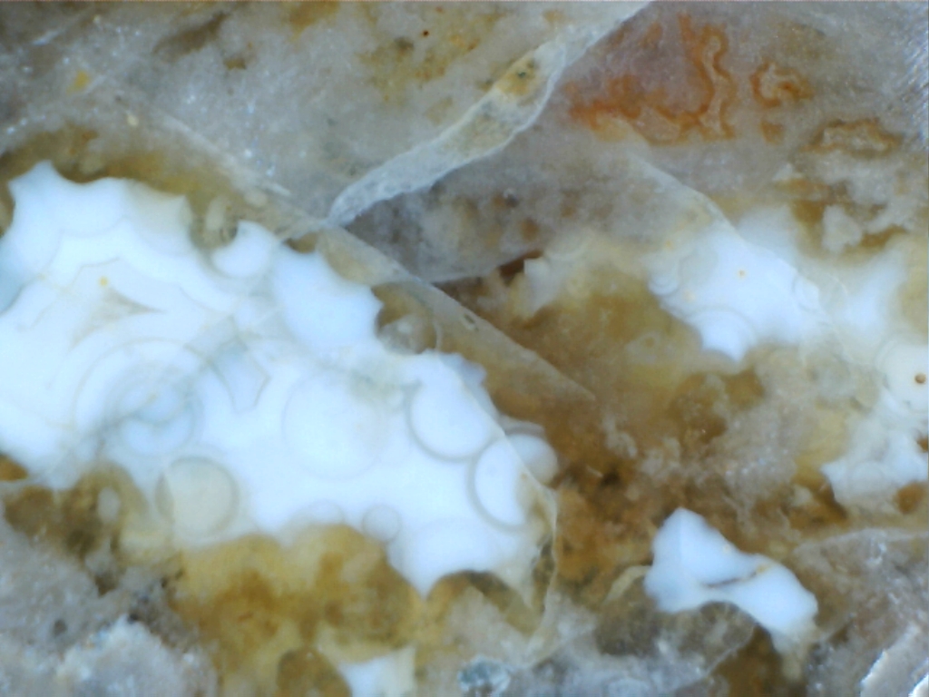 Click for larger images. The second image here is from inside the pale rhombic pseudomorph visible in the stone.