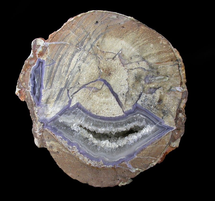 This is what a Dugway 'should' be. Savage and tense with that violet agate looking more like a lightning strike than a sweet border. That, more than in many Dugways, seems to bear out its thunderegg kinship as it possesses the sense of torn rock and frozen energy that is characteristic of a good thunderegg. This one is even more striking for its almost alarming grinning, toothy mouth and eyeless face. An absolute classic!
